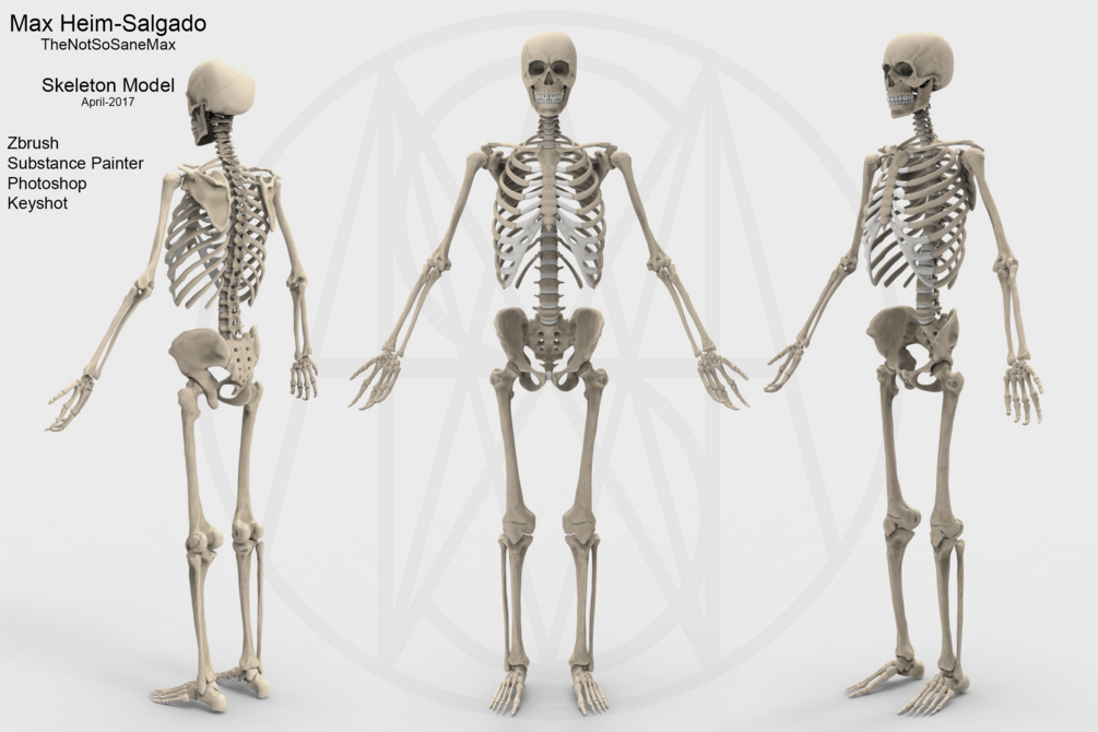 This is my completed sculpt of the human skeleton. It was created over the course of a few months using reference ranging from general measurements to scan data. I made three textured versions.